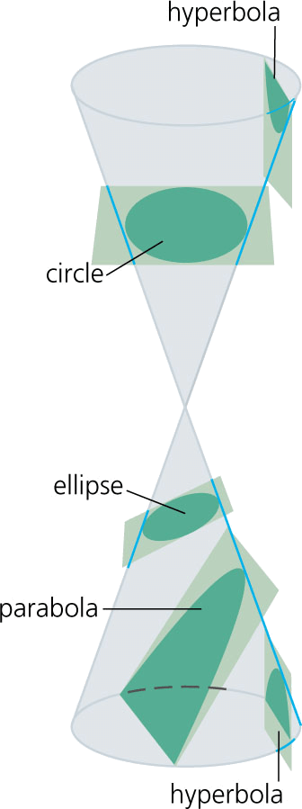conic sectionn.(名词) conic sections created by the intersection of various planes of a right circular coneClarinda/Academy Artworks- The intersection of a right circular cone and a plane, which generates one of a group of plane curves, including the circle, ellipse, hyperbola, and parabola.圆锥曲线:一正圆锥与一平面相切产生的一组平面曲线,包括圆、椭圆、抛物线和双曲线