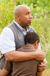 A father consoles his son.