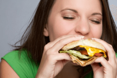 A woman consumes a hamburger.