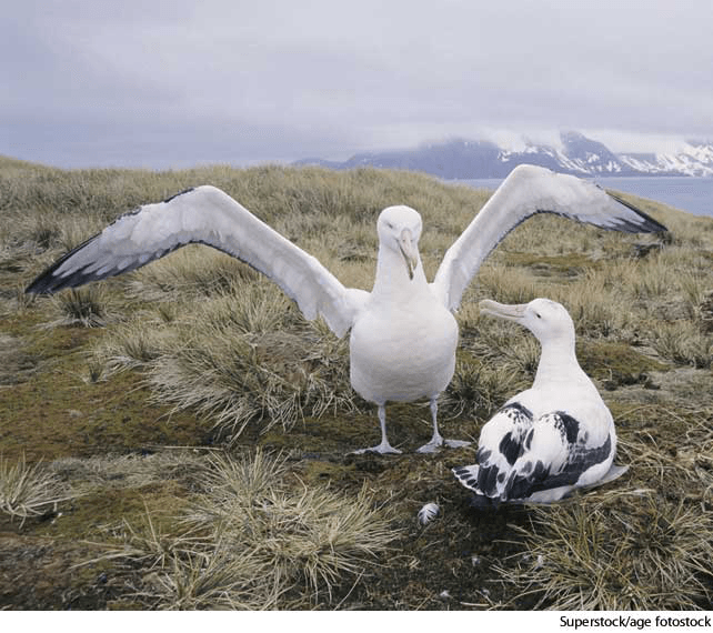 1. Any of several large, web-footed birds constituting the family Diomedeidae, chiefly of the oceans of the Southern Hemisphere, and having a hooked beak and long, narrow wings.信天翁:组成信天翁科的大型有脚蹼的鸟类,主要产于南半球海域,喙呈钩状,翅长而窄