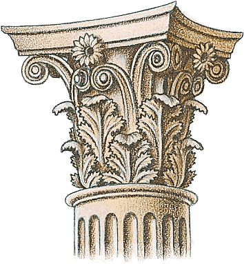 The most ornate of the three classical orders, characterized by a slender fluted column having an ornate bell-shaped capital decorated with acanthus leaves.科林斯式:三种古典式样中最华丽的一种,特点是柱子细长,有凹槽,柱头华丽,钟状,饰有叶板