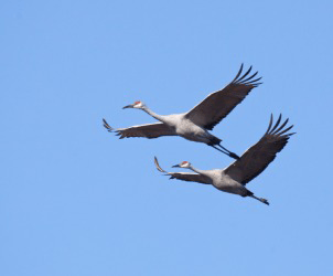 Two cranes in flight.