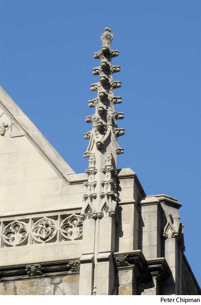 crock·et AHD[krŏkʹĭt] D.J.[ˈkrɒkɪt]K.K.[ˈkrɑkɪt]n.Architecture(名词)【建筑学】 crocketEmmanuel ChurchBoston, Massachusetts- A projecting ornament, usually in the form of a cusp or curling leaf, placed along outer angles of pinnacles and gables.卷叶饰:一种放置在小尖塔以及三角墙的外角上的、通常为尖头或卷叶状的突起饰物