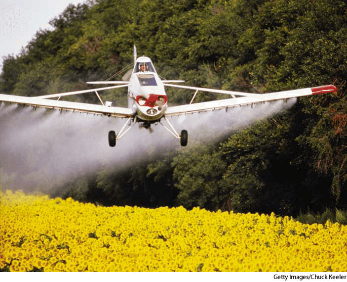 农作物喷粉:从飞机上向农作物喷洒粉末状杀虫剂或杀菌剂的过程
