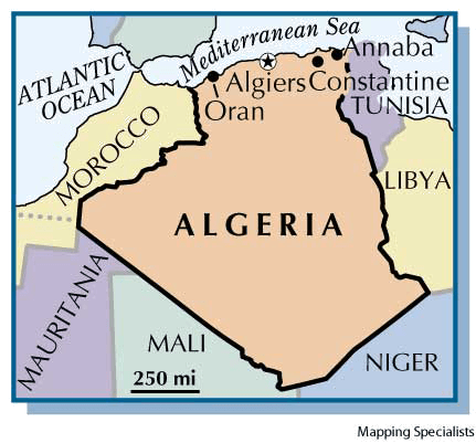 Al·ge·ri·a AHD[ăl-jîrʹē-ə] abbr.缩写 Alg.D.J.[ælˈdʒɪəriːə]K.K.[ælˈdʒɪriə]NONE(无词性) Algeria- A country of northwest Africa bordering on the Mediterranean Sea. Algeria gained its independence from France in 1962 after a long terrorist and guerrilla campaign. Algiers is the capital and the largest city. Population, 16,948,000.阿尔及利亚:非洲西北部滨邻地中海的国家。经过长期的恐怖主义活动和游击战争,阿尔及利亚于1962年脱离法国统治宣布独立。阿尔及尔是首都及最大的城市。人口16,948,000