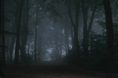 A road through a dark forest.