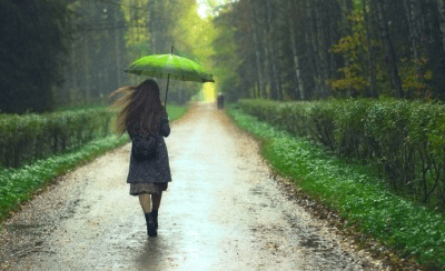 A woman takes a walk despite the rain.
