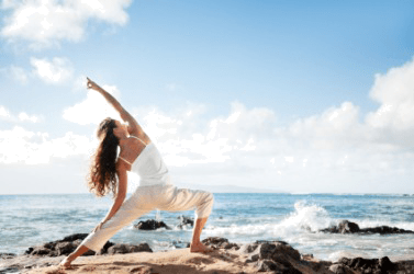 A dexterous woman practices yoga.