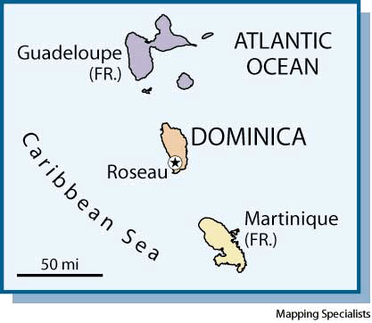 1. An island country of the eastern Caribbean between Guadeloupe and Martinique. Discovered by Christopher Columbus in 1493, the island became a British colony in the early 1800's and gained its independence in 1978. Roseau is the capital. Population, 77,000.多米尼加:位于瓜德罗普岛和马提尼克岛之间的加勒比海东部岛国,1493年为哥伦布发现,19世纪早期成为英国殖民地,1978年获得独立。首都罗索。人口77,000