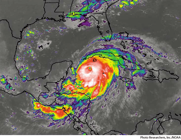 Color image of Hurricane Ivan (2004) produced by Doppler radar. Blue indicates light rainfall; red indicates the heaviest rainfall.