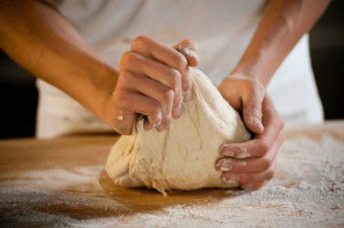 A baker kneads a lump of dough.
