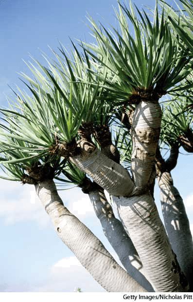 龙血树属) 具有厚大的树干,剑形的叶簇与类似柑橘的果实
