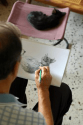 A man draws a picture of his cat.