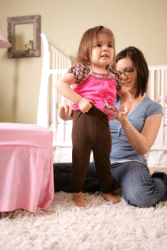 A mother helping her daughter to dress.