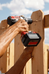 A man using a drill to build a fence.