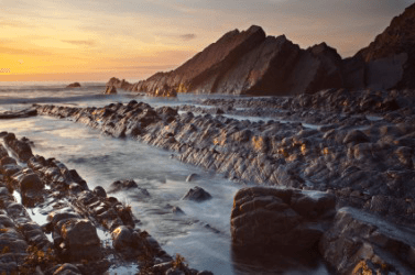 A beach at dusk.