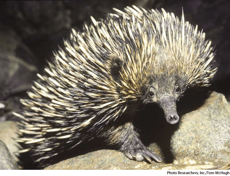 1. Any of several nocturnal, burrowing, egg-laying mammals of the generaTachyglossus and Zaglossus of Australia, Tasmania, and New Guinea, having a spiny coat, slender snout, and an extensible sticky tongue used for catching insects. Also called spiny anteater 针鼹:任一种夜间活动的针鼹属 和 原针鼹属 的穴居卵生哺乳动物,生活在澳大利亚、塔斯马尼亚和新几内亚,外皮带针状物,吻细长,舌带粘液并可伸缩,可用来捕获昆虫 也作 spiny anteater
