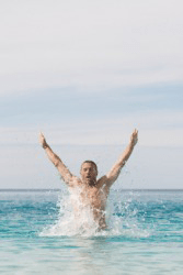 A swimmer emerges from the water.