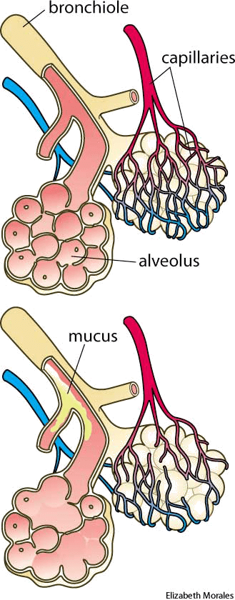 em·phy·se·ma AHD[ĕm'fĭ-sēʹmə, -zēʹ-] D.J.[ˌemfɪˈsiːmə, -ˈziː-]K.K.[ˌɛmfɪˈsimə, -ˈzi-]n.(名词) emphysematop: normal bronchiole and alveolibottom: diseased bronchiole with mucus, enlarged air sacs in the alveoli, and fewer capillaries- A pathological condition of the lungs marked by an abnormal increase in the size of the air spaces, resulting in labored breathing and an increased susceptibility to infection. It can be caused by irreversible expansion of the alveoli or by the destruction of alveolar walls.肺气肿:肺部的一种病态,特征为肺中的空间不正常地增大,导致呼吸困难并且易于受感染。它是由肺小泡的不可逆的扩张或肺小泡壁被破坏而引起的