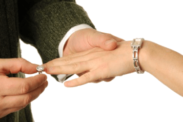 This man offers a woman a ring of engagement.