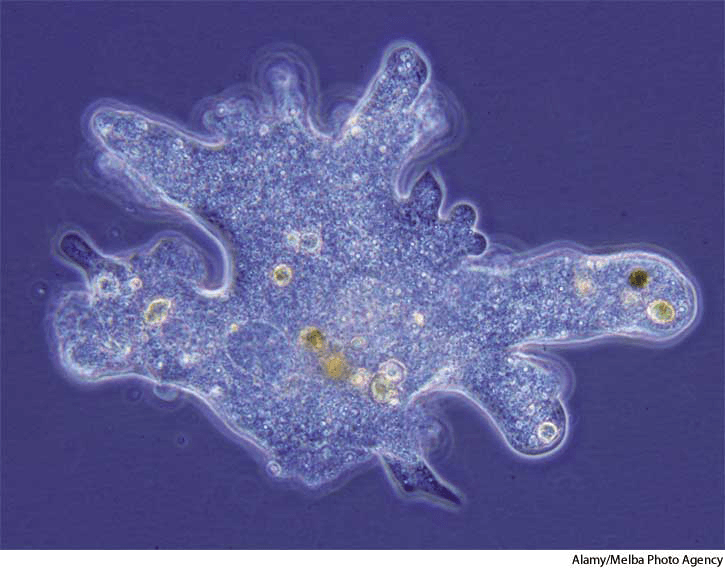 amoeba 也作 a·me·ba AHD[ə-mēʹbə] D.J.[əˈmiːbə]K.K.[əˈmibə]n.(名词)【复数】 a.moe.bas 或 a.moe.bae [-bē]  amoeba- A protozoan of the genusAmoeba or related genera, occurring in water and soil and as a parasite in other animals. An amoeba has no definite form and consists essentially of a mass of protoplasm containing one nucleus or more surrounded by a delicate, flexible outer membrane. It moves by means of pseudopods. 变形虫,阿米巴:一种变形虫属 或相关属的原生动物,存在于淡水和土壤里,或为其它动物的寄生虫。变形虫没有固定形体,身体主要由原生质组成,包括由一个柔软、有韧性的外膜包围的一个或一个以上的细胞核。变形虫系由伪足移动
