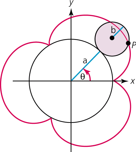 ep·i·cy·cloid AHD[ĕp'ĭ-sīʹkloid'] D.J.[ˌepɪˈsaɪˌklɔɪd]K.K.[ˌɛpɪˈsaɪˌklɔɪd]n.(名词) The parametric equations of a three-cusped epicycloid are:x = (a + b) cosθ - b cos a + b/bθy = (a + b) sinθ - b sin a + b/bθClarinda/Academy Artworks- The curve described by a point on the circumference of a circle as the circle rolls on the outside of the circumference of a second, fixed circle.外摆线:一个动圆沿另一个定圆外侧滚动时,动圆圆周上一点的轨迹曲线