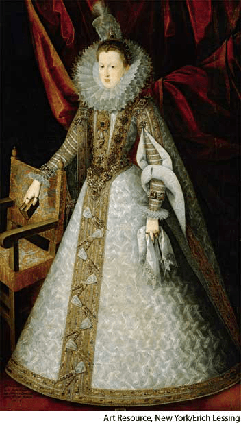 far·thin·gale AHD[fär"Yĭn-gāl', -Yĭng-] D.J.[ˈfɑːðɪnˌgeɪl, -ðɪŋ-]K.K.[ˈfɑrðɪnˌgel, -ðɪŋ-]n.(名词) farthingaleportrait of Queen Margaret of Austria (1584-1611) by Juan Pantajo de la Cruz (1553-1608)- A support, such as a hoop, worn beneath a skirt to extend it horizontally from the waist, used by European women in the 16th and 17th centuries.鲸骨衬箍:16和17世纪的欧洲妇女所用的一种穿在裙子里面,用来将裙子的自腰以下水平撑开的箍