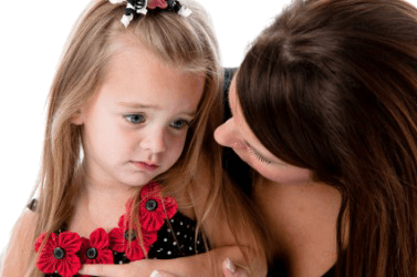 A woman comforts her child who is feeling sad.