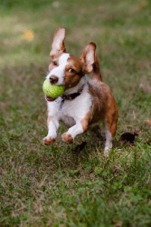 A dog fetches a ball.