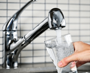 Someone fills a glass with water.