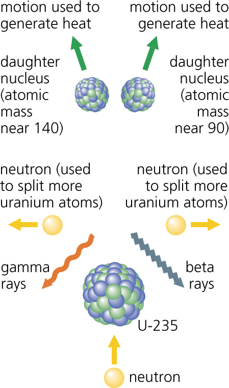 - A nuclear reaction in which an atomic nucleus, especially a heavy nucleus such as an isotope of uranium, splits into fragments, usually two fragments of comparable mass, with the evolution of from 100 million to several hundred million electron volts of energy.裂变:一种如铀的同位素等重核的原子核核反应,通常分裂成两个质量相近的碎片并能释放出100万到几百万电子伏的能量