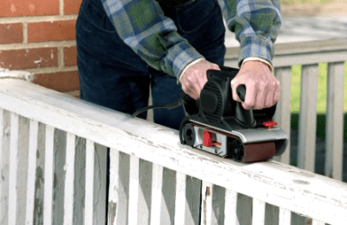A man fixes the railing of his porch.