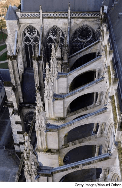 flying buttressn.Architecture(名词)【建筑学】 flying buttressCathedral of Notre-DameAmiens, France- A masonry support consisting usually of a pier or buttress standing apart from the main structure and connected to it by an arch along which the thrust, as from the vaulting, is borne. Also called arc-boutant 拱扶垛:一种硅石砌体构筑物,通常由桥墩或偏离主要结构并通过拱门与其相连的拱壁组成,沿着拱门可从拱形圆顶产生推力 也作 arc-boutant