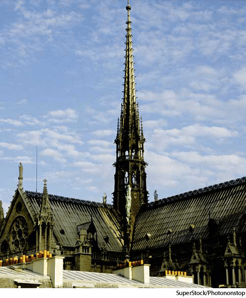 flèche AHD[flĕsh, flāsh] D.J.[fleʃ, fleɪʃ]K.K.[flɛʃ, fleʃ]n.(名词) flèchec. 1860 flèche on the Cathedral of Notre-DameParis, France- A slender spire, especially one on a church above the intersection of the nave and transepts.尖塔:一种纤细的尖顶,尤指教堂的中殿与十字形耳堂相交处的上部的塔尖
