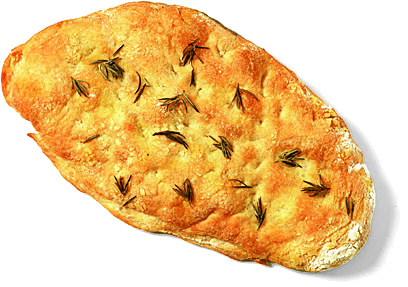 1. A flat Italian bread traditionally flavored with olive oil and salt and often topped with herbs, onions, or other items.意式香饼:一种以橄榄油、盐调味再铺上香草、洋葱及其它配料的意大利传统面包