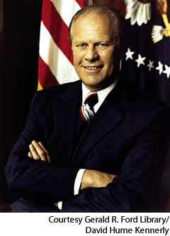 Ford, Gerald Rudolph (Born 1913)NONE(无词性) Gerald Ford- The 38th President of the United States (1974-1977), who was appointed Vice President on the resignation of Spiro Agnew (1973) and became President after Richard Nixon's resignation over the Watergate scandal. As President, Ford granted a full pardon to Nixon (1974).福特,杰拉尔德·鲁道夫:(生于 1913) 美国第38届总统(1974-1977年),在斯皮罗·阿格纽(1973年)辞职后被任命为副总统并在理查德·尼克松因水门事件丑闻辞职后升为总统。作为总统,他对尼克松(1974年)之过一概不究