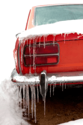 Icicles hang from a car on a frigid day.