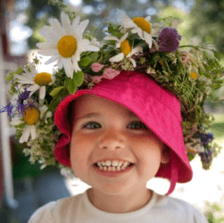 A child with a garland of flowers on her hat.