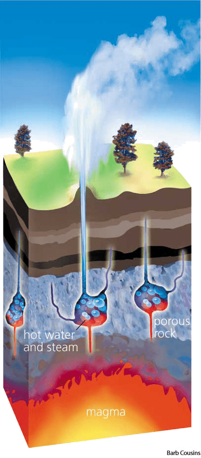 gey·ser AHD[gīʹzər] D.J.[ˈgaɪzə]K.K.[ˈgaɪzɚ]n.(名词) geyserWater contained in porous rock seeps into an opening. Heated by magma below, it escapes under pressure to the earth's surface.- A natural hot spring that intermittently ejects a column of water and steam into the air.间歇泉:间歇向空中喷水花和蒸汽柱的天然温泉