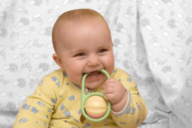 A baby gnaws a toy.