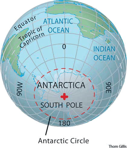 南极圈:赤道以南约66°33′的一条纬线,形成南温带和南寒带的分界线
