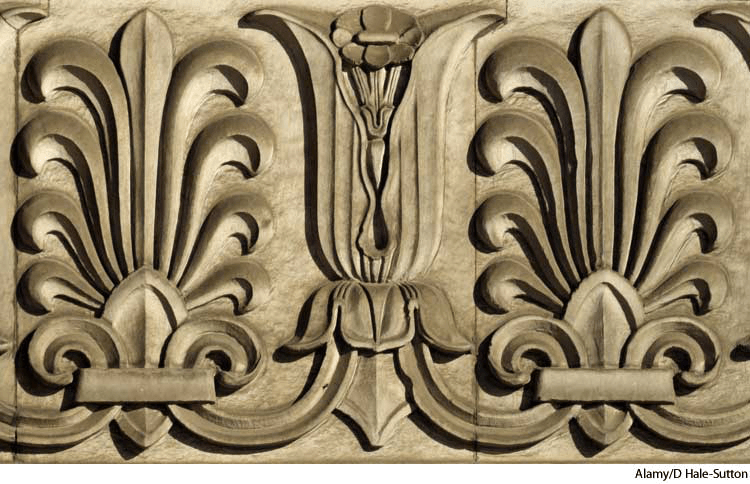 an·the·mi·on AHD[ăn-thēʹmē-ən] D.J.[ænˈθiːmiːən]K.K.[ænˈθimiən]n.(名词)【复数】 an.the.mi.a[-mē-ə]  anthemiondetail of anthemions and a palmette on the exterior of the Royal Scottish Academy of ArtEdinburgh, Scotland- A pattern of honeysuckle or palm leaves in a radiating cluster, used as a motif in Greek art.花束状装饰,棕叶饰:忍冬花束或棕榈叶束的图案,是古希腊艺术的基本图案