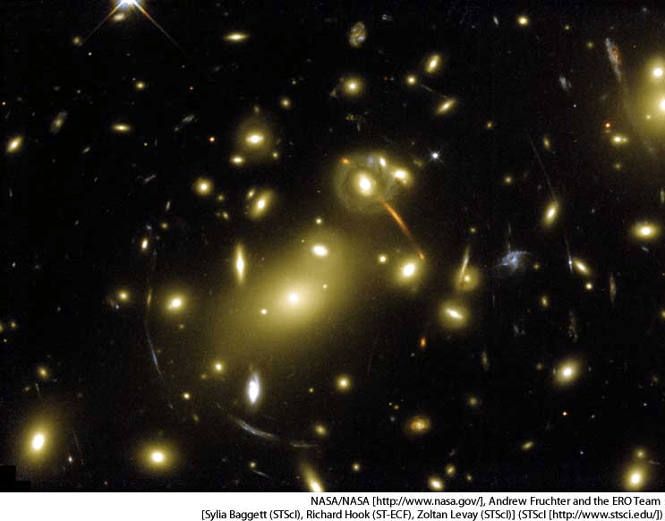 gravitational lensn.(名词) gravitational lensAbell 2218, a cluster of galaxies in the constellation Draco- A massive celestial object, such as a galaxy, whose gravity bends and focuses the light of a more distant object, resulting in a magnified, distorted, or multiple image of the original light source for a distant observer.重力透镜:一群大规模的星体,例如一个银河系,其重力弯曲且集中于较远距离星体的亮光,对远距离观测者产生一个扩大的、扭曲的、重复的原始光源影像