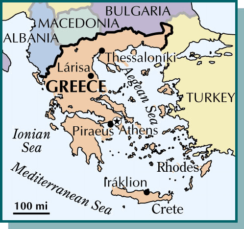 Greece AHD[grēs] 原名 Hel.las [hĕlʹəs] abbr.缩写 Gr.D.J.[griːs] 原名 Hel·las [ˈheləs]K.K.[gris] 原名 Hel·las [ˈhɛləs]NONE(无词性) - A country of southeast Europe on the southern Balkan Peninsula and including numerous islands in the Mediterranean, Aegean, and Ionian seas. One of the most important centers of early civilization, Greece grew and flourished as an amalgam of independent city-states, although intercity strife led to conquest by Philip II of Macedon in 338b.c. Greece was ruled by the Ottoman Turks from the 15th century a.d. until its independence in 1829. Athens is the capital and the largest city. Population, 9,740,417. 希腊:欧洲东南部国家,位于巴尔干半岛南部,包括地中海、 爱琴海和爱奥尼亚海上无数的小岛。系为人类早期文明最重要的几个中心之一,希腊以一种独立城邦混合体的形式发展并繁荣起来。因其城市之间的斗争于公元前 338年被马其顿帝国腓力二世征服。从 公元 15世纪受奥斯曼土耳其的统治,直到1829年独立。雅典是其首都和最大城市。人口9,740,417