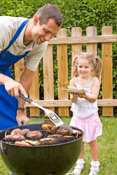 A man cooks food on a grill for his daughter.