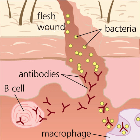 an·ti·bod·y AHD[ănʹtĭ-bŏd'ē, ăn'tī-] D.J.[ˈæntɪˌbɒdiː, ˌæntaɪ-]K.K.[ˈæntɪˌbɑdi, ˌæntaɪ-]n.(名词) When bacteria enter a flesh wound, a B lymphocyte releases antibodies, which collect the bacteria and direct them toward a macrophage for destruction.Clarinda/Academy Artworks- A protein substance produced in the blood or tissues in response to a specific antigen, such as a bacterium or a toxin. Antibodies destroy or weaken bacteria and neutralize organic poisons, thus forming the basis of immunity.抗体,免疫体:血液或组织针对某种抗原如细菌或毒素而产生的蛋白质物质。抗体消灭细菌或削弱其作用,中和有机毒素,因而形成免疫力