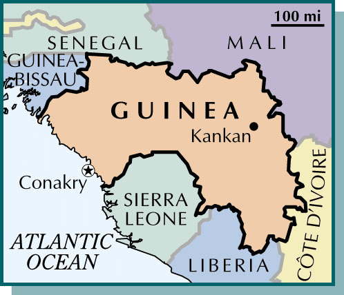 1. A country of western Africa on the Atlantic Ocean. It was a French colony from 1898 until 1958, when it gained its independence. Conakry is the capital and the largest city. Population, 4,830,000.几内亚:非洲西部一国家,位于大西洋沿岸。从1898至1958为法国殖民地,1958年赢得独立。科纳克里为该国首都及最大城市。人口4,830,000