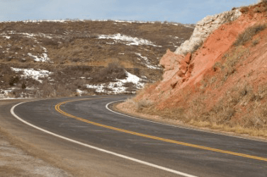 A hillside abuts the road.
