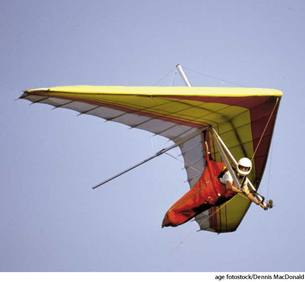 悬挂式滑翔机:一种象风筝似的装置,当飞机在某个高度滑翔时,飞行员固定在上面