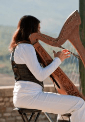 A woman playing a harp.